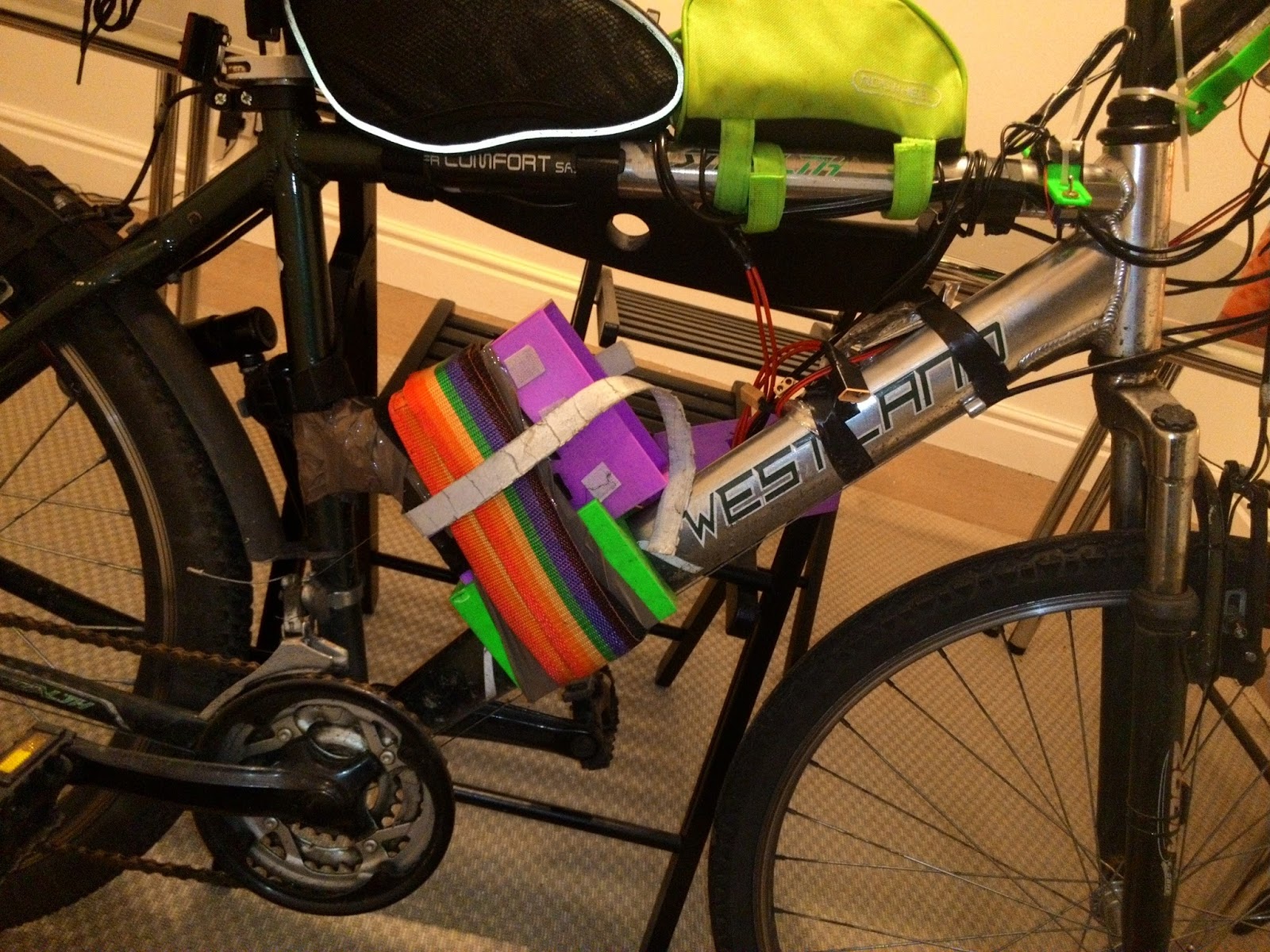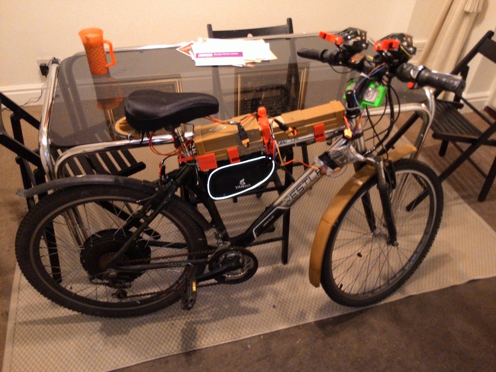 The bike runs on an 12 cell lipo battery pack made from quite old around 10 years lipo batteries. Things tagged with 18650.