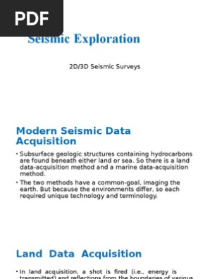 Difference between 2d and 3d seismic data acquisition. Essentially the conventional approach to 3d seismic survey design is a straightforward extension of the 2d stack array approach anstey 1986 to 3d. 3d seismic programs are generally a uniform and evenly spaced grid of lines. Land and 2d vs. The same line contains recording cables and geophones as well as source points.
